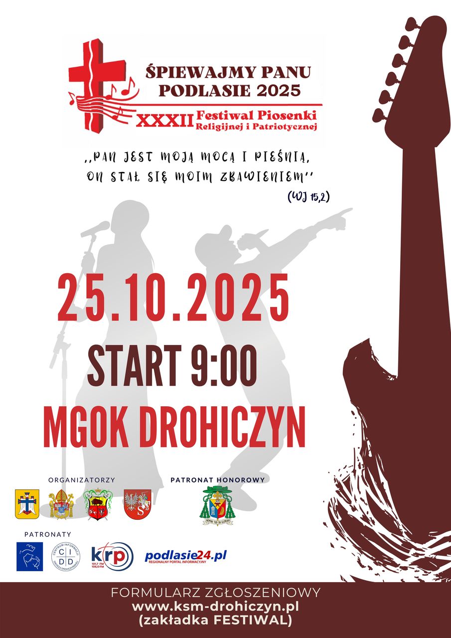 32. Festiwal Piosenki Religijnej i Patriotycznej „Śpiewajmy Panu” Podlasie 2025 odbędzie się w sobotę, 25 października w Drohiczynie.