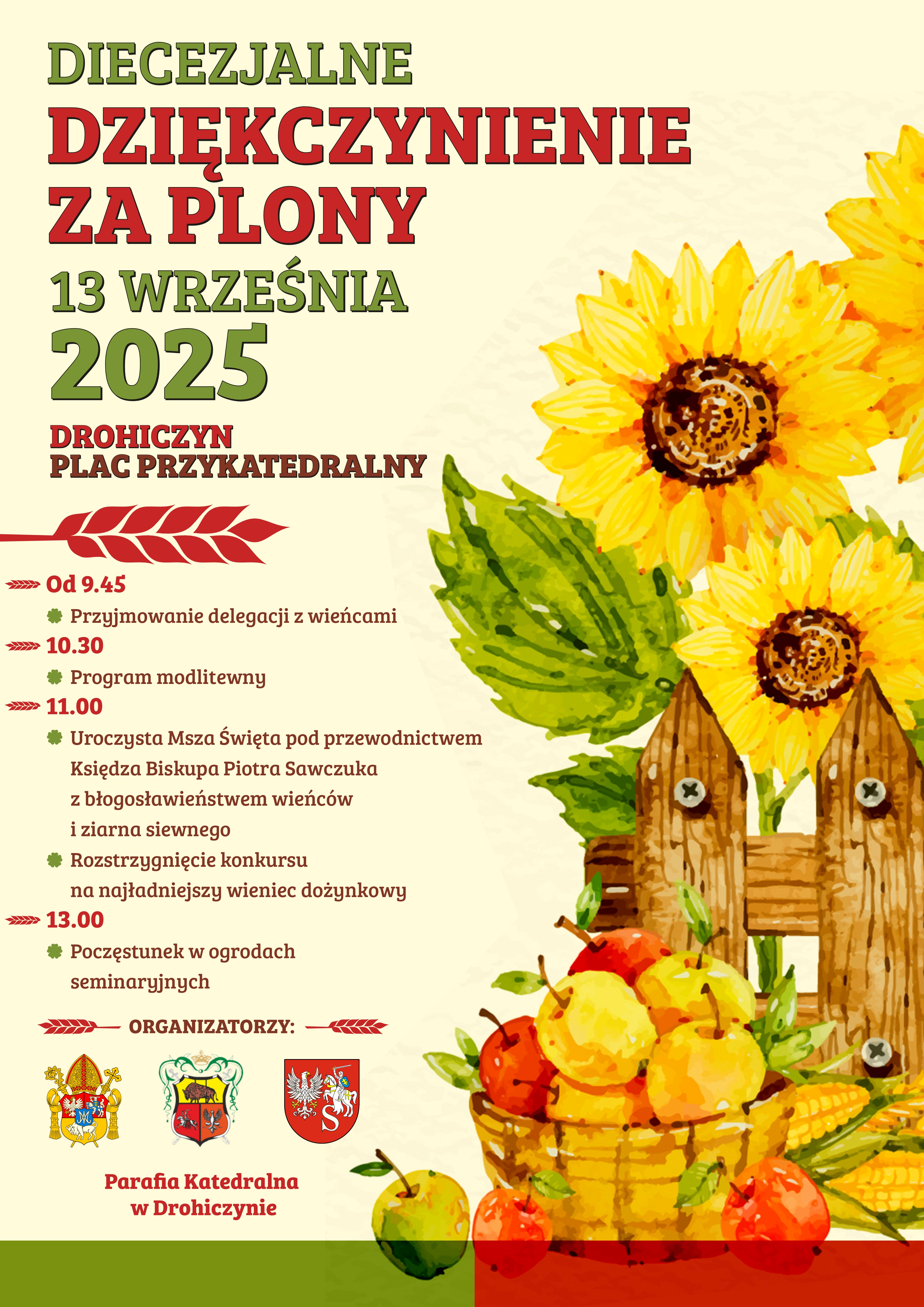 Diecezjalne Dożynki Diecezji Drohiczyńskiej odbędą się w tym roku w Drohiczynie. Zostaną zorganizowane we współpracy z Urzędem Miasta i Gminy Drohiczyn i Powiatem Siemiatyckim. Liturgii będzie przewodniczył ksiądz biskup Piotr Sawczuk.