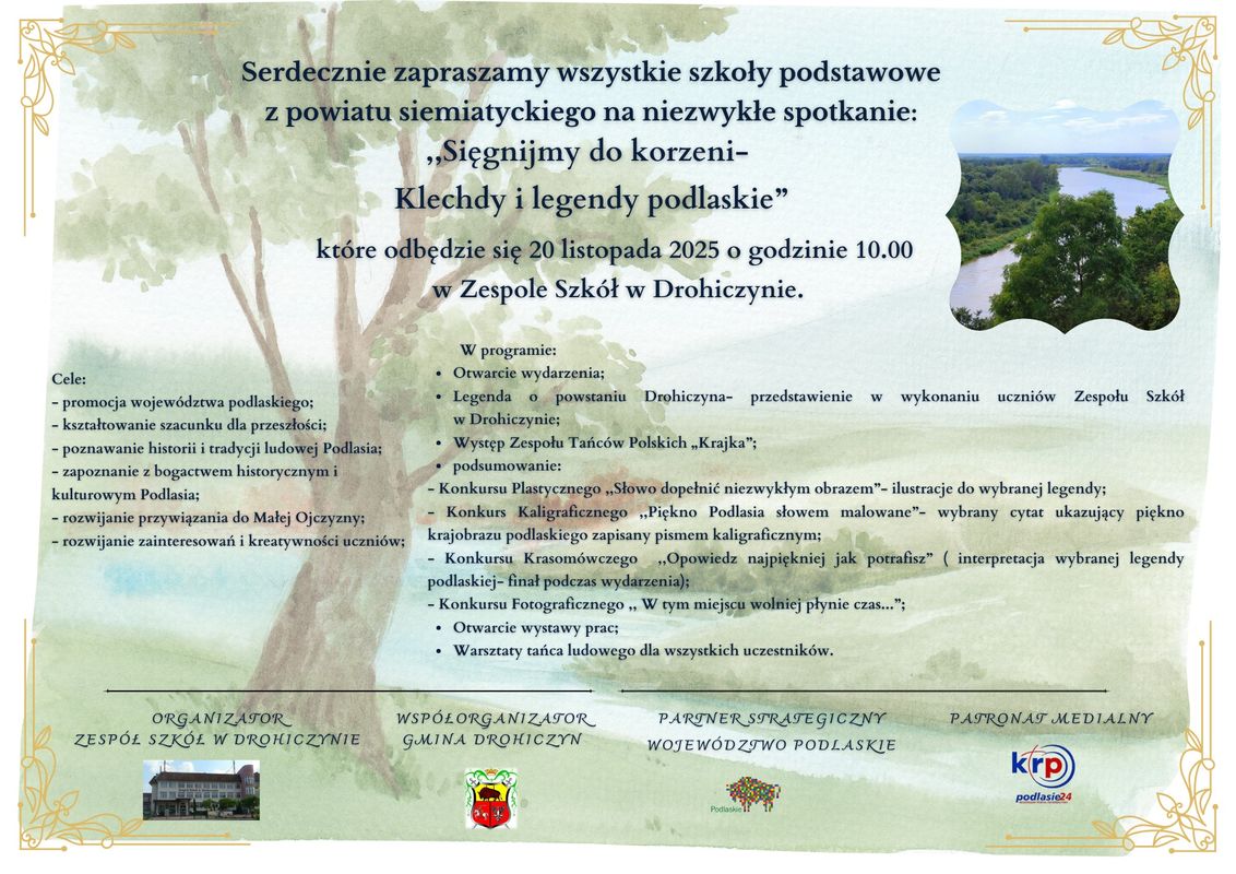 Zespół Szkół w Drohiczynie wraz z Gminą Drohiczyn realizują inicjatywy pod hasłem „Sięgnijmy do korzeni – klechdy i legendy podlaskie”. To cztery zadania, do których zaproszono uczniów ze szkół z powiatu siemiatyckiego.