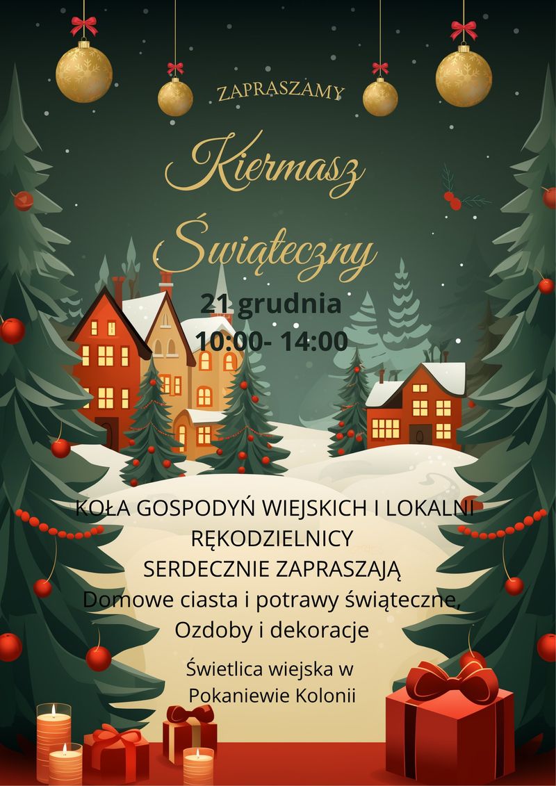 W gminie Milejczyce, w świetlicy wiejskiej w Pokaniewie Koloni w niedzielę, 21 grudnia w godzinach 10:00 – 14:00 odbędzie się kiermasz przygotowany przez Koła Gospodyń Wiejskich i lokalnych rękodzielników. Będą domowe ciasta, potrawy świąteczne i dekoracje.