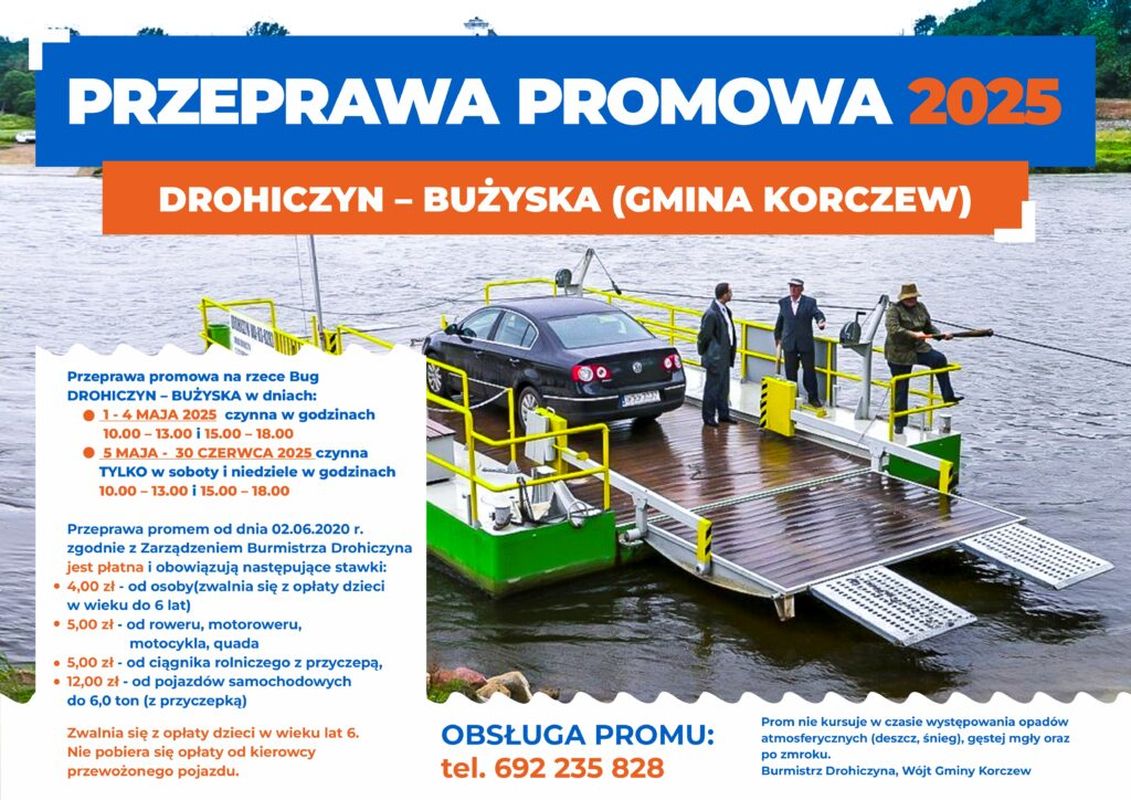 Do końca czerwca prom Drohiczyn – Bużyska będzie kursował w soboty i niedziele.Podobna przeprawa promowa funkcjonuje też pomiędzy gminami Mielnik i Sarnaki, łącząca Mielnik i Zabuże. Prom kursuje codziennie.