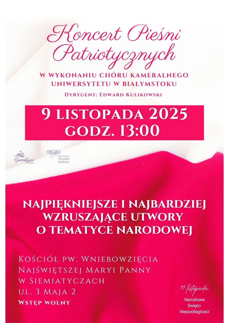 9 listopada (niedziela), 13:00 – Koncert Pieśni Patriotycznych w wykonaniu Chóru Kameralnego Uniwersytetu w Białymstoku, Kościół pw. WNMP w Siemiatyczach