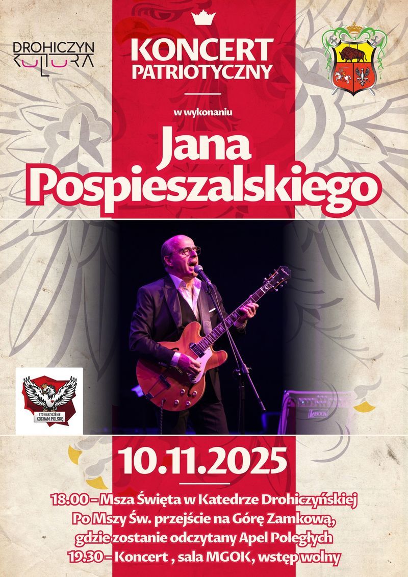 - 19:30 – Koncert patriotyczny w wykonaniu Jana Pospieszalskiego (sala MGOK), wstęp wolny