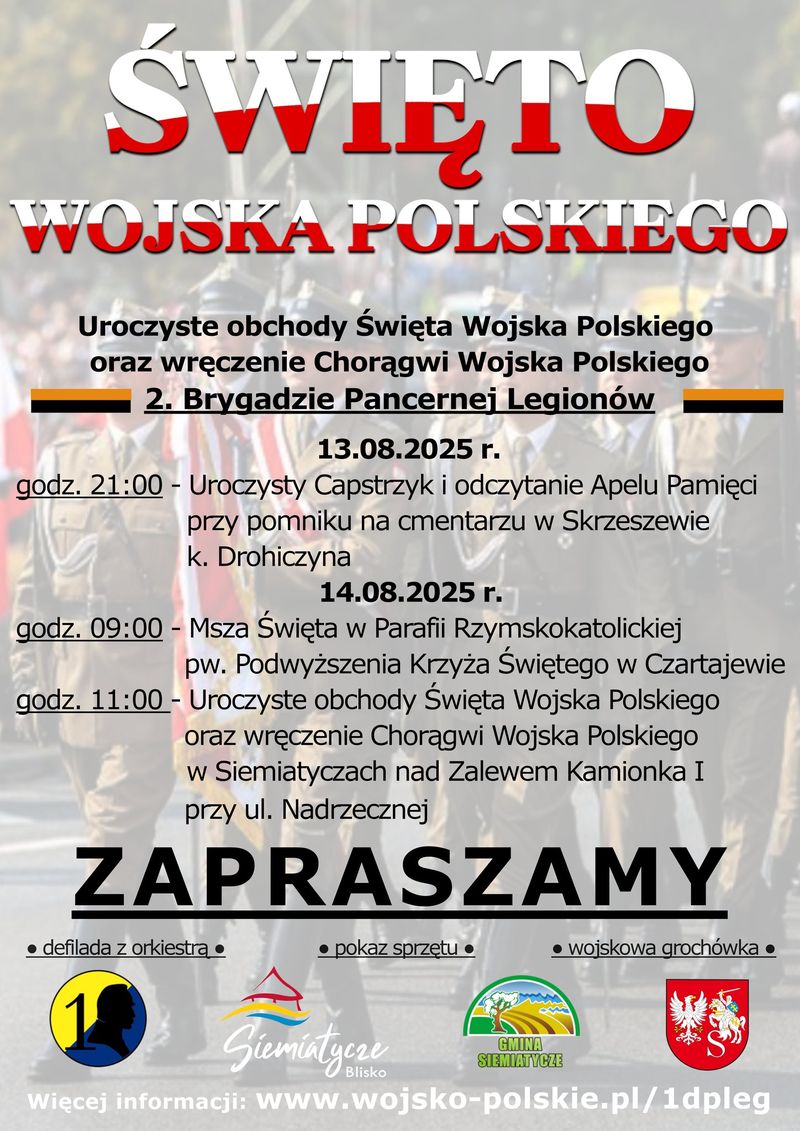 1 Dywizja Piechoty Legionów zaprasza na uroczyste obchody Święta Wojska Polskiego w Skrzeszewie i Siemiatyczach. Uroczystości, połączone będą z ceremonią wręczenia Chorągwi Wojska Polskiego 2. Brygadzie Pancernej Legionów, odbędą się w dniach 13–14 sierpnia.