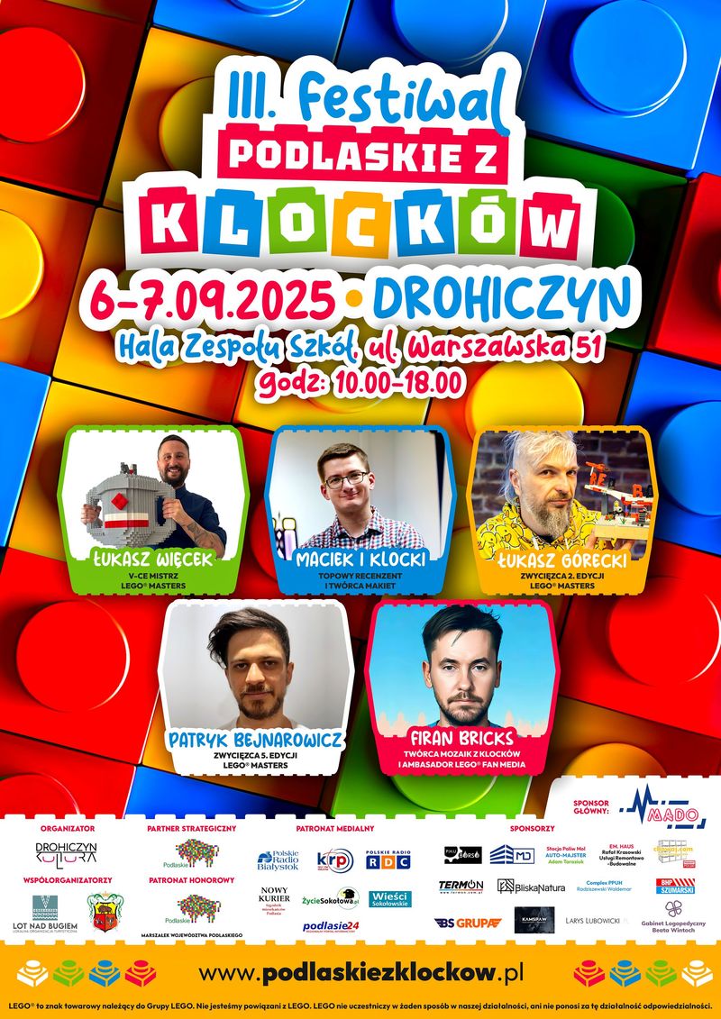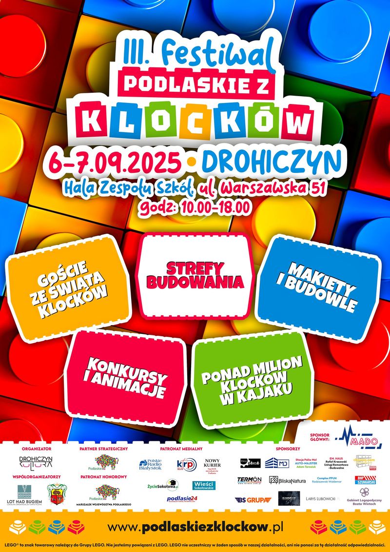 W Drohiczynie po raz kolejny królować będą klocki. W dniach 6–7 września (sobota i niedziela) w Drohiczynie nad Bugiem odbędzie się „III Festiwal – Podlaskie z Klocków”. Do udziału zaproszeni są wszyscy, którzy lubią zabawę klockami – niezależnie od wieku!