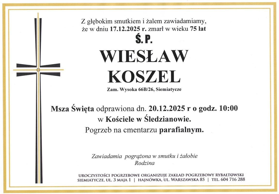 W wieku 75 lat zmarł Wiesław Koszel, wieloletni kapelmistrz lokalnych orkiestr dętych, animator kultury, społecznik. Zmarł 17 grudnia, uroczystości pogrzebowe odbędą się w sobotę, 20 grudnia w Śledzianowie w gminie Drohiczyn.